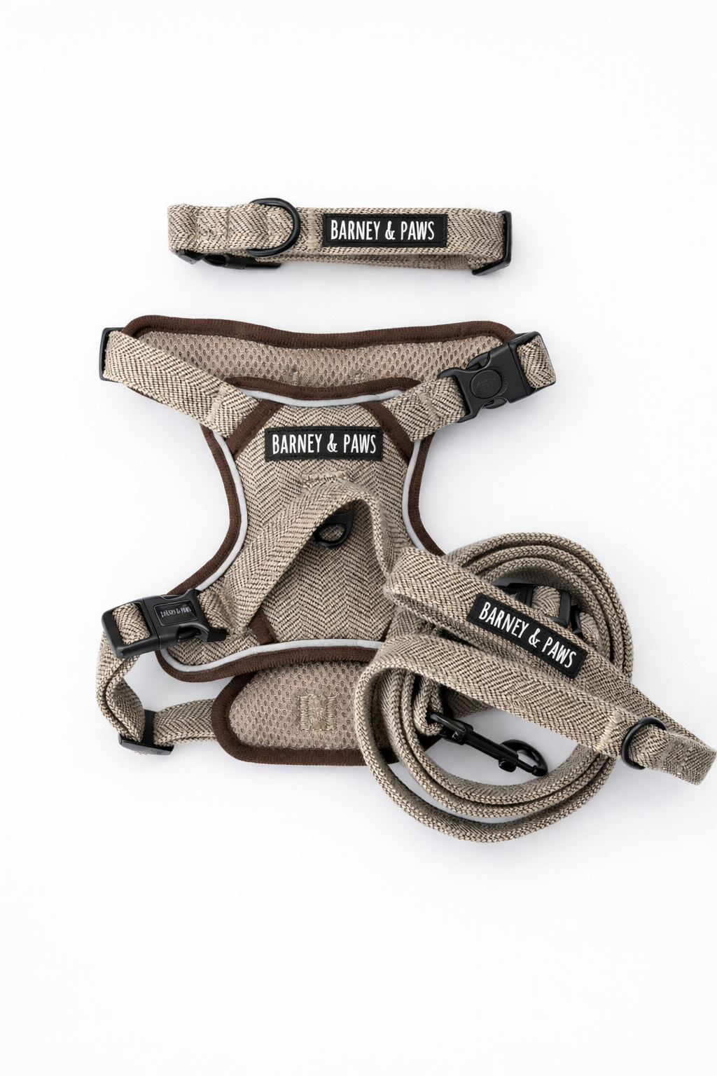 Its warm tweed-inspired pattern and deep chocolate trim create a beautifully traditional look — perfect for pups who love muddy walks, crisp autumn strolls, and cosy countryside days out.