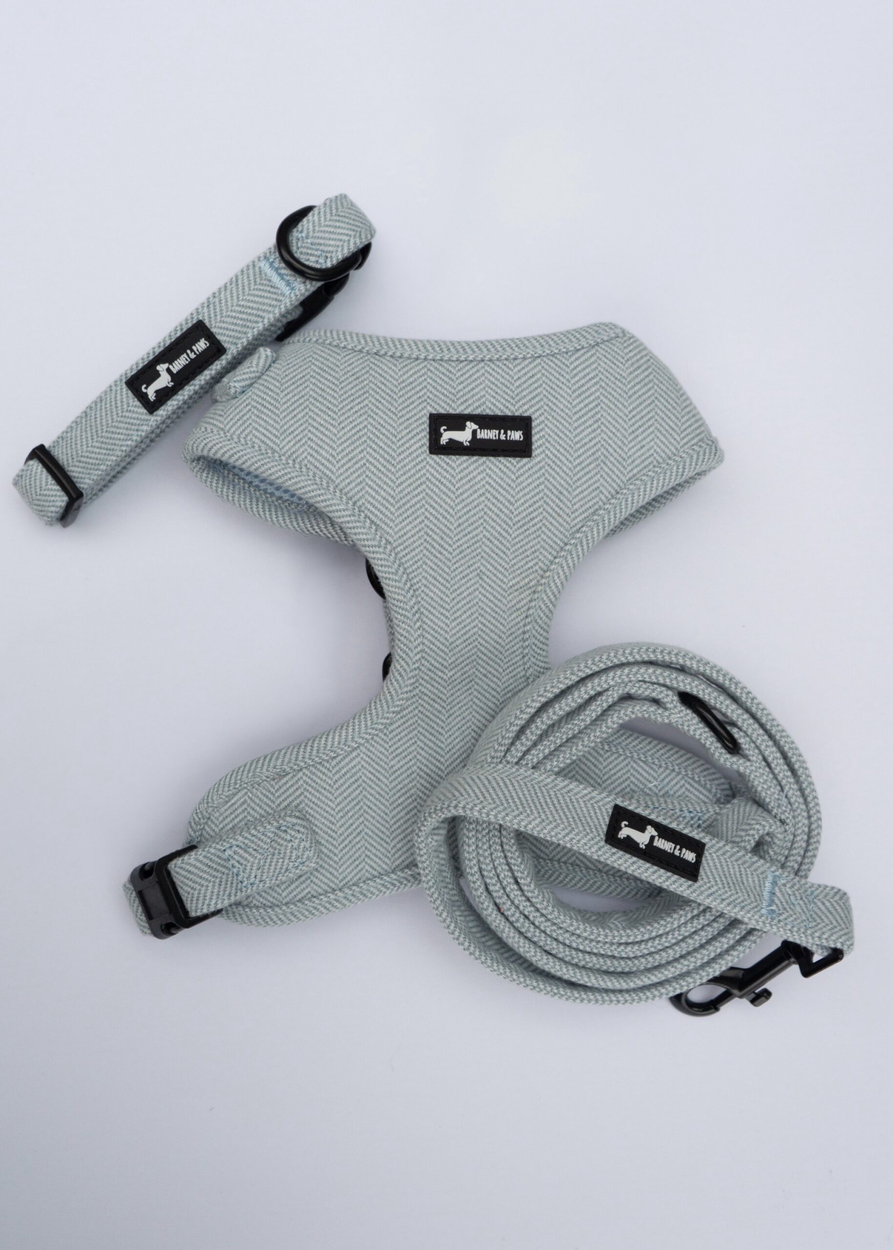 Cool and crisp like a winter’s morning, Herringbone Frost brings a refreshing twist to classic style. This icy-toned set is finished with a subtle herringbone pattern — perfect for pups who like to keep things refined yet playful.