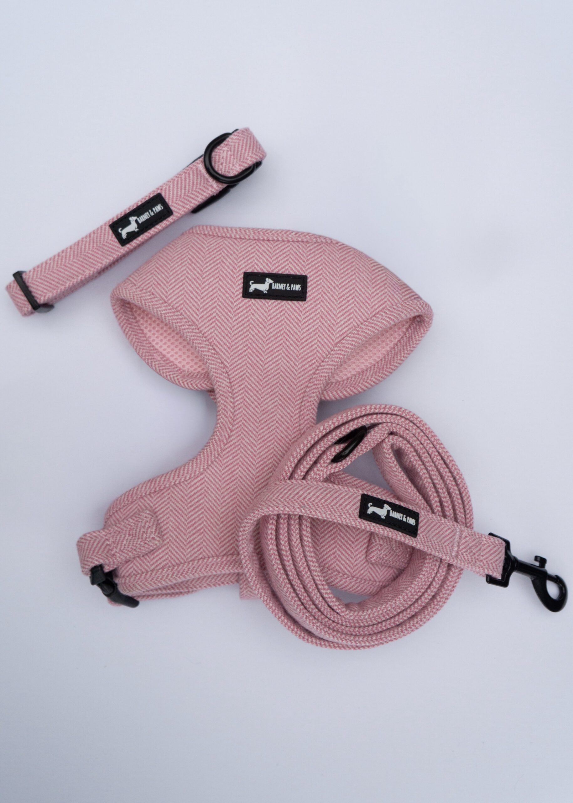 The full 3-piece set includes our Adjustable Neck Harness, a matching Collar, and an easy-to-hold Lead — all finished with black hardware and crafted for everyday wear with a touch of timeless style.