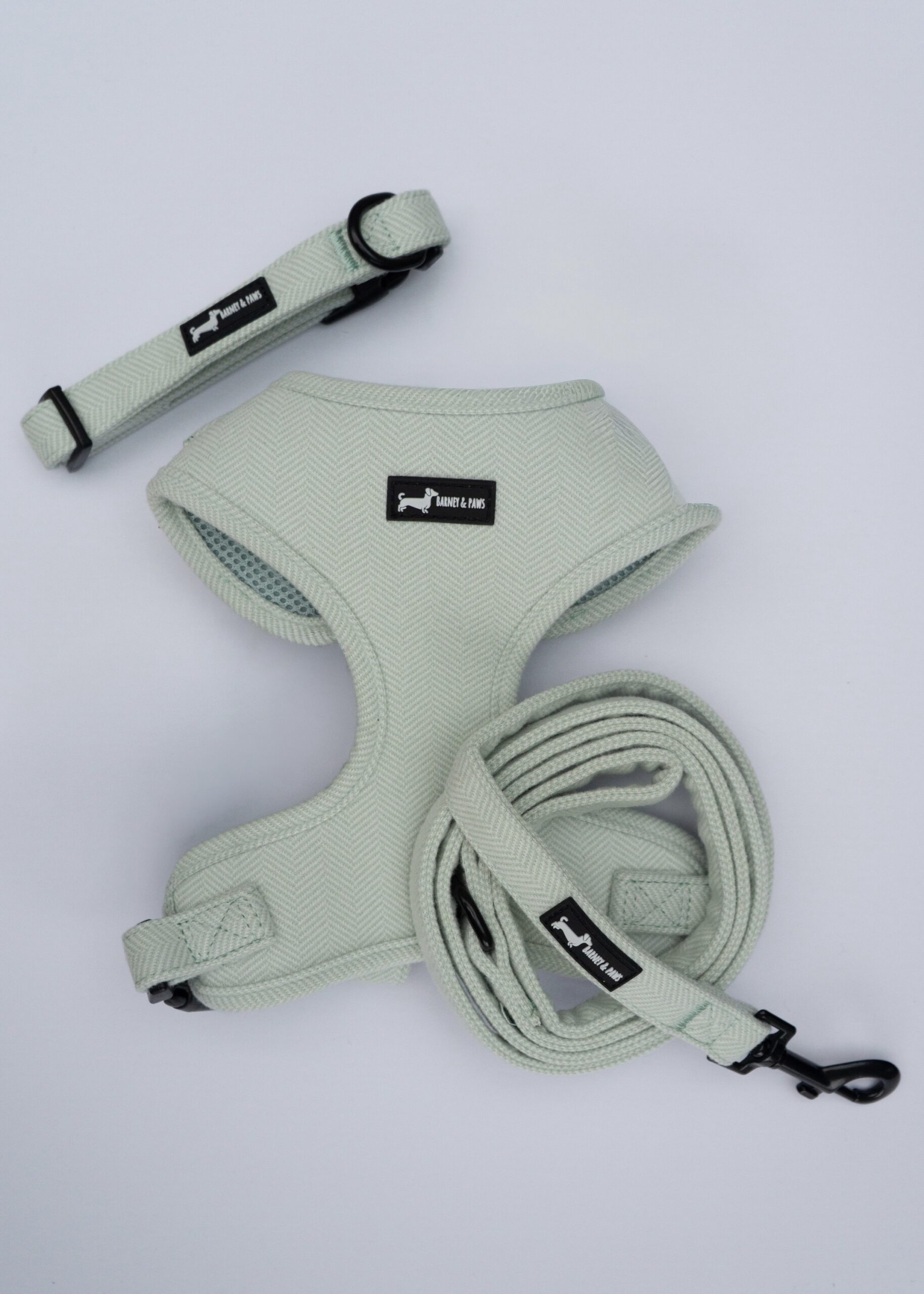 The full 3-piece set includes our Adjustable Neck Harness, a coordinating Collar, and a lightweight, easy-grip Lead — all finished with sleek black hardware and crafted for comfort, security, and timeless style.