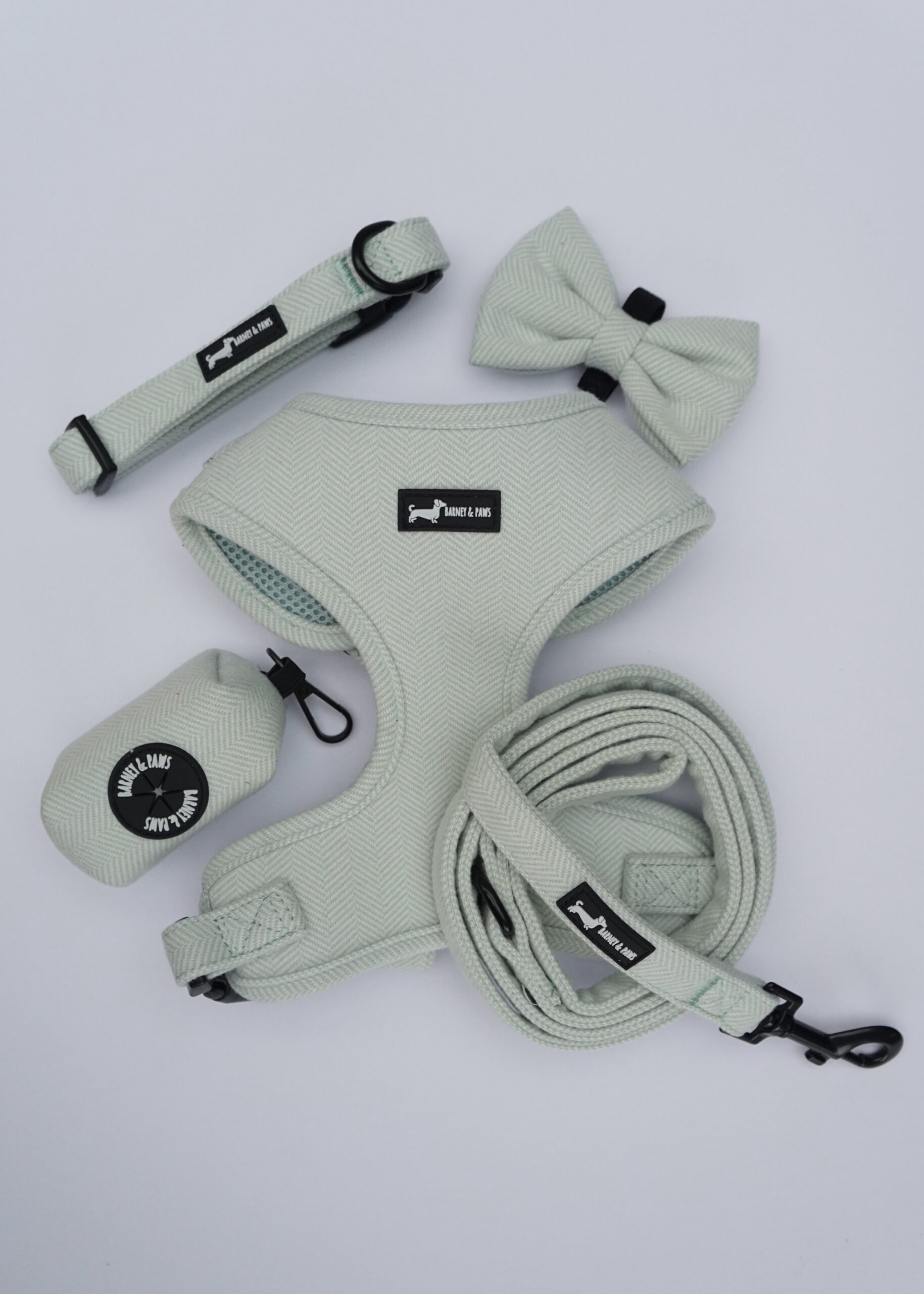 The full 6-piece set includes our Adjustable Neck Harness, matching Collar and Lead, plus a coordinating Poop Bag Holder, Bow Tie, and Bandana — giving your pup the complete head-to-tail look.