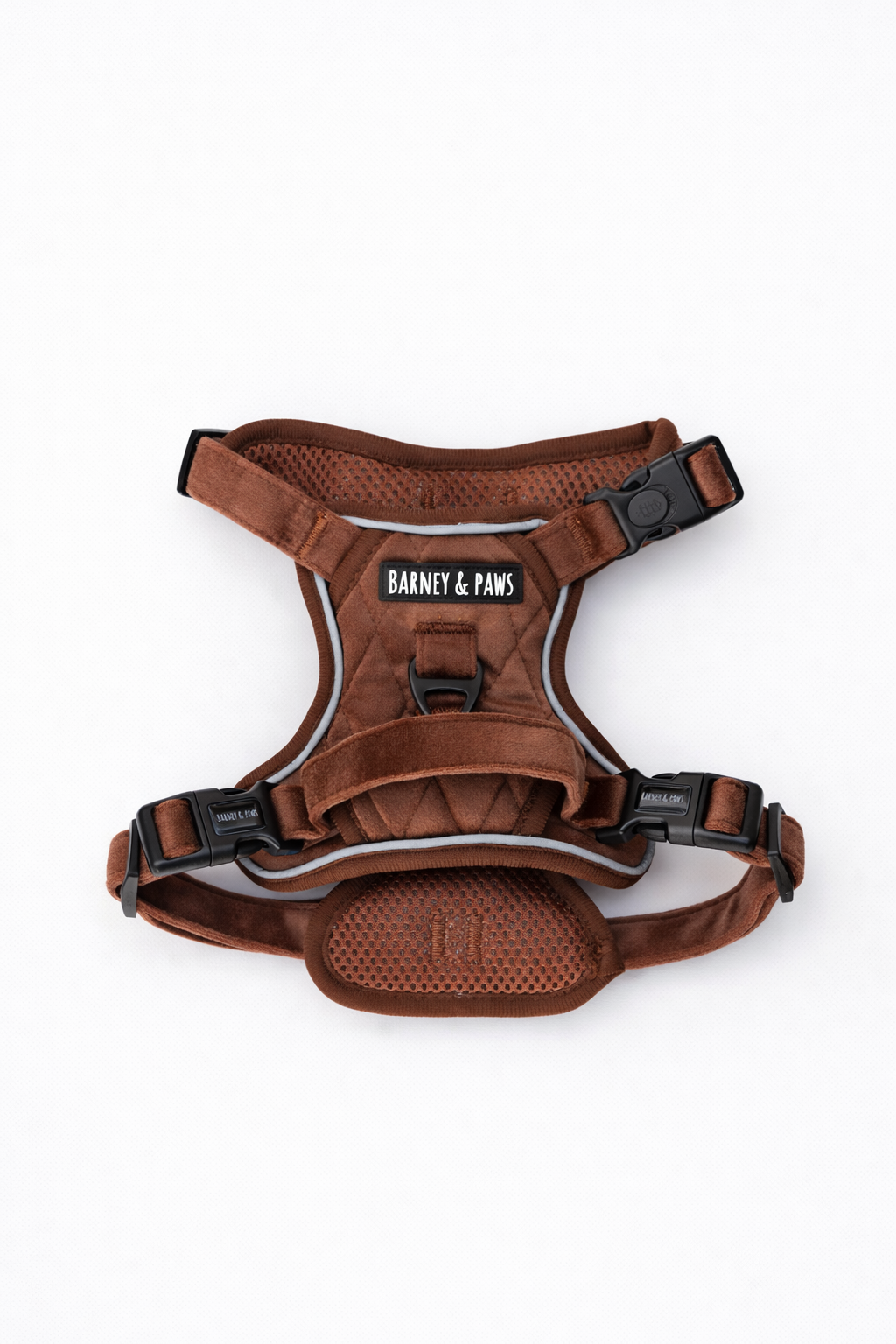 Our Quilted Chestnut 3-Click Harness offers a perfect blend of comfort and control, wrapped in a soft quilted fabric that looks as good as it feels. Featuring three easy-to-use buckles and both front and back D-rings, it’s built for flexibility, training, and everyday walks. Fully adjustable at the neck and chest, with a breathable padded mesh interior — this harness delivers a snug, secure fit without sacrificing comfort.